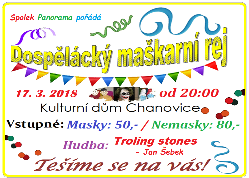 O víkendu v sobotu 17. 3. 2018 se budou konat v KD Chanovice maškarní veselice pro děti a pak pro dospělé.