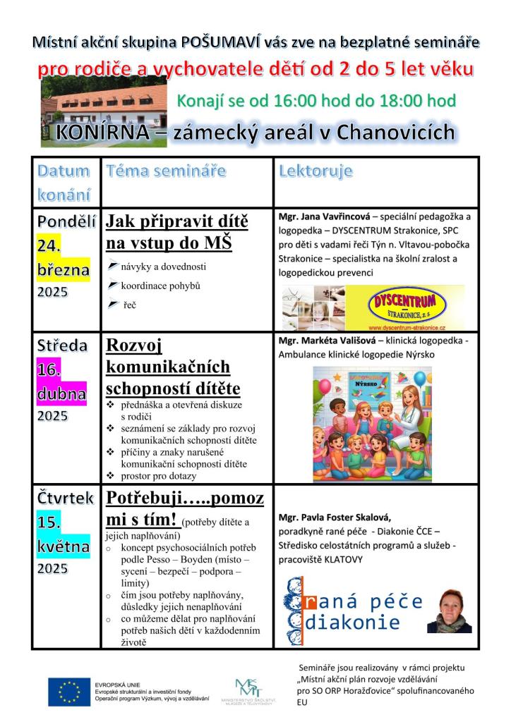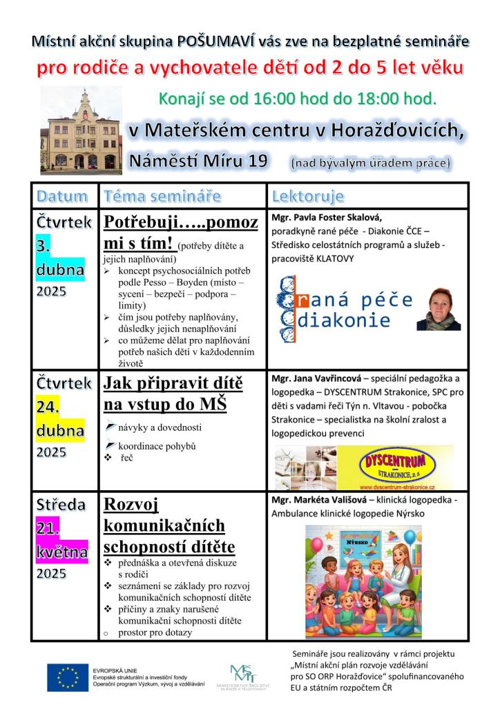 Na Horažďovicku započala série seminářů určených rodičům dětí ve věku od 2 do 6 let, tedy těm rodičům, kteří potřebují připravit své dítě do života školkového a školního. Obsahově stejné semináře budou probíhat na 2 místech - v Chanovicích a v Horažďovicích v odpoledních hodinách. Blíže viz. letáky